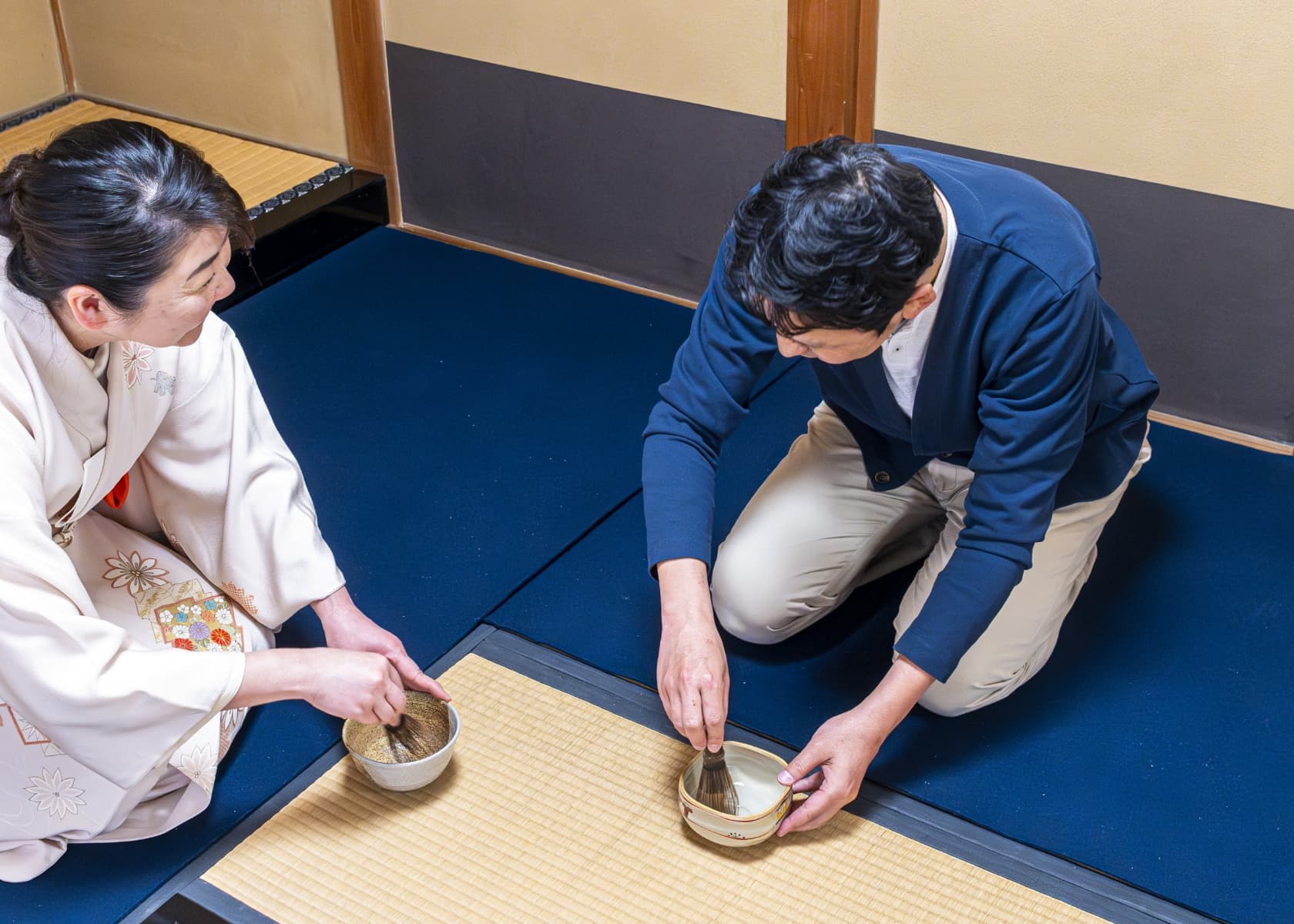 ご自身で抹茶を点てて飲んでみましょう。お菓子と共にお楽しみください。ご不明な点がございましたら、お気軽にお尋ねください。